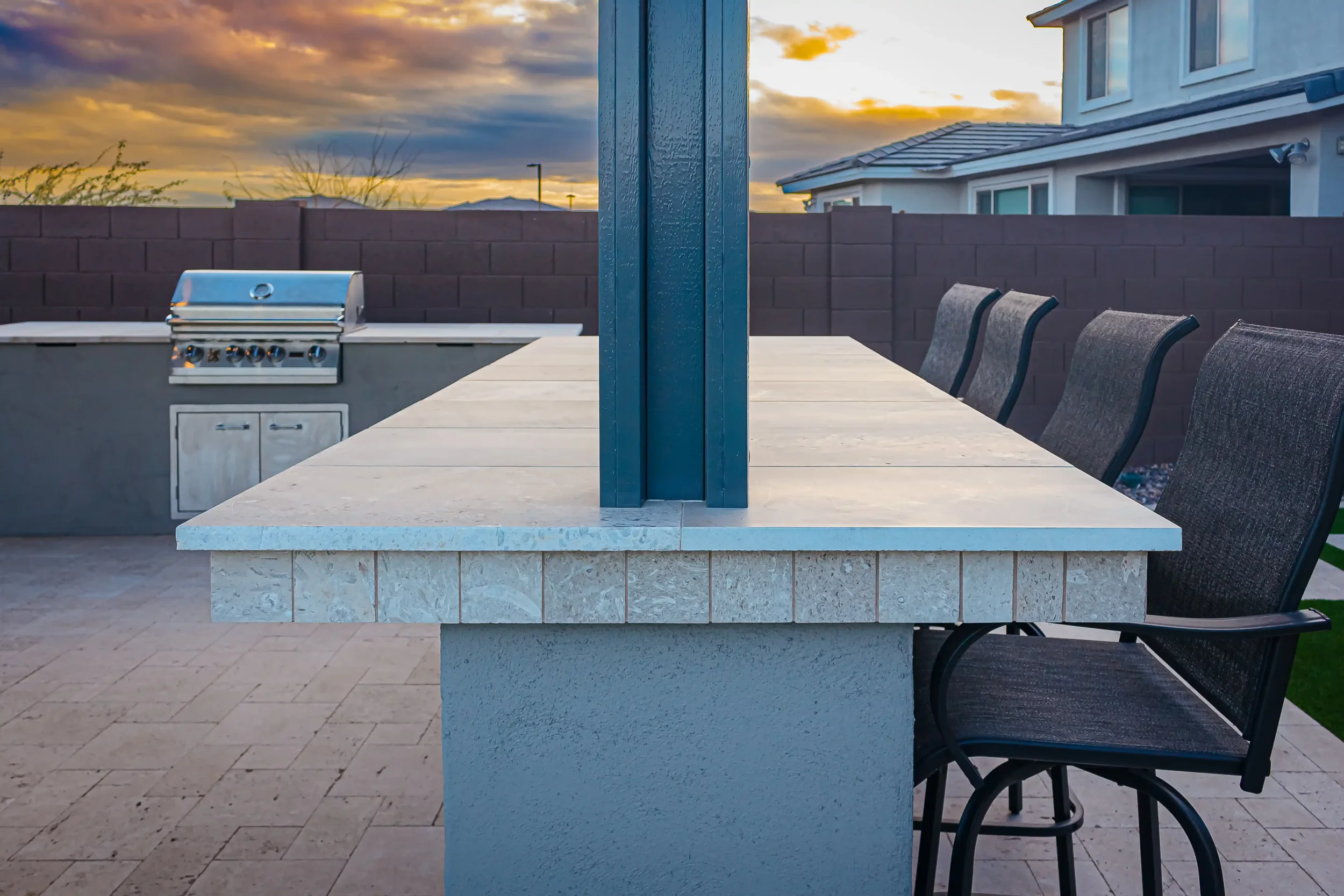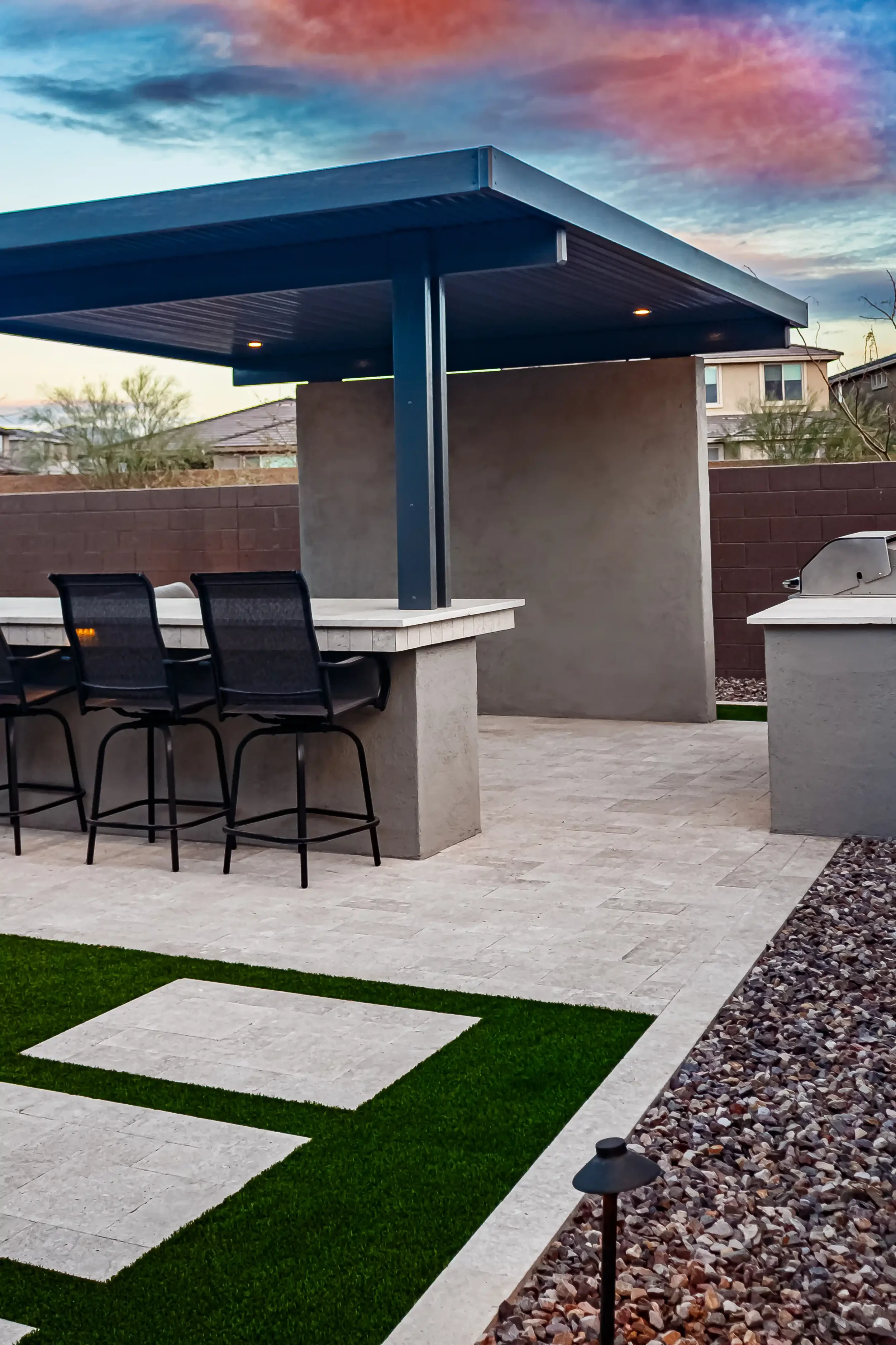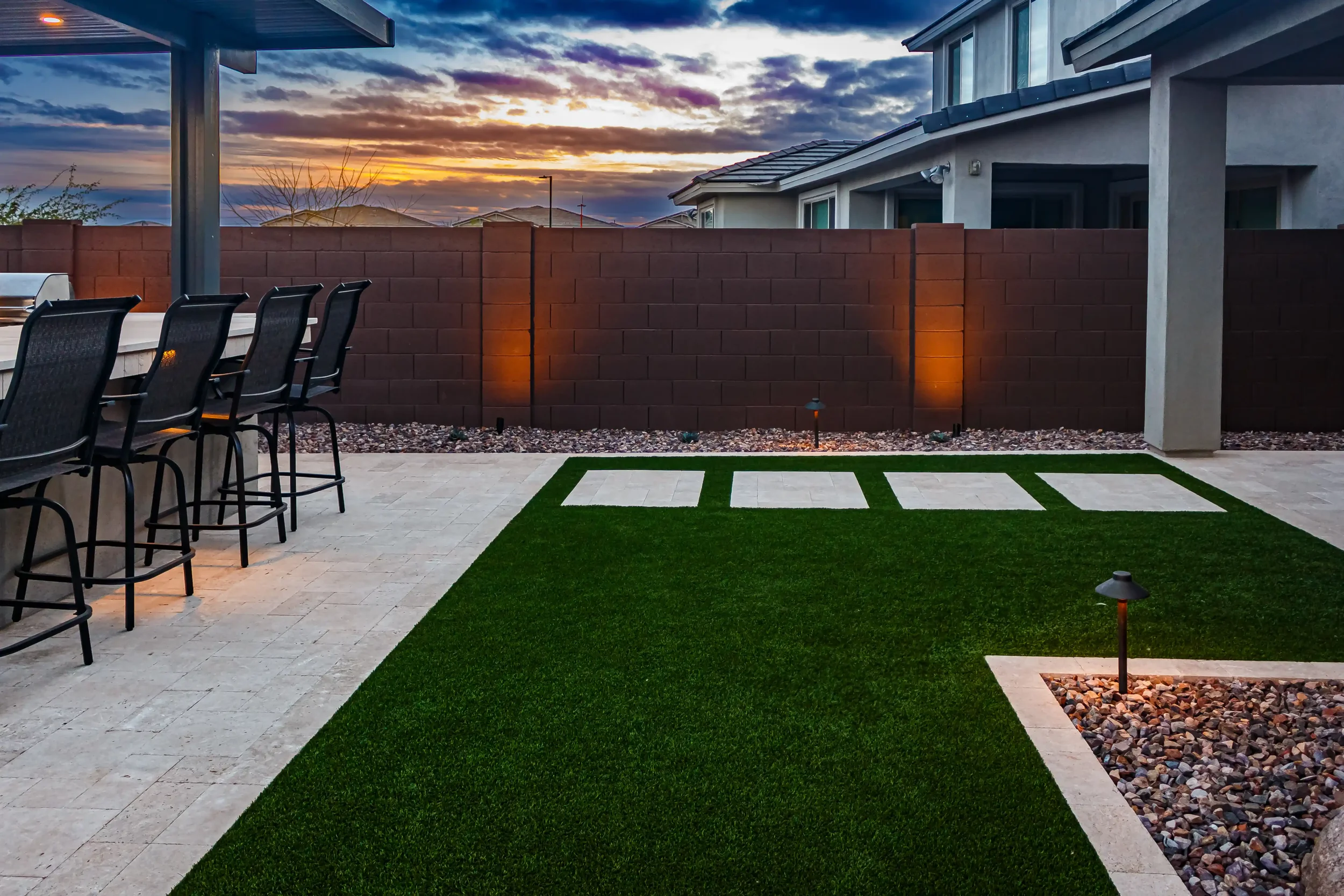 We designed and built a layout centered around a modern pergola, an outdoor kitchen with bar seating, and a comfortable media wall. Two turf areas were added—one for the family and one designed specifically for the dog. Travertine and pavers created a clean, durable foundation that fits the neighborhood. The lighting, planting, and mounding were some of the most appreciated details because they helped the yard feel complete rather than pieced together.