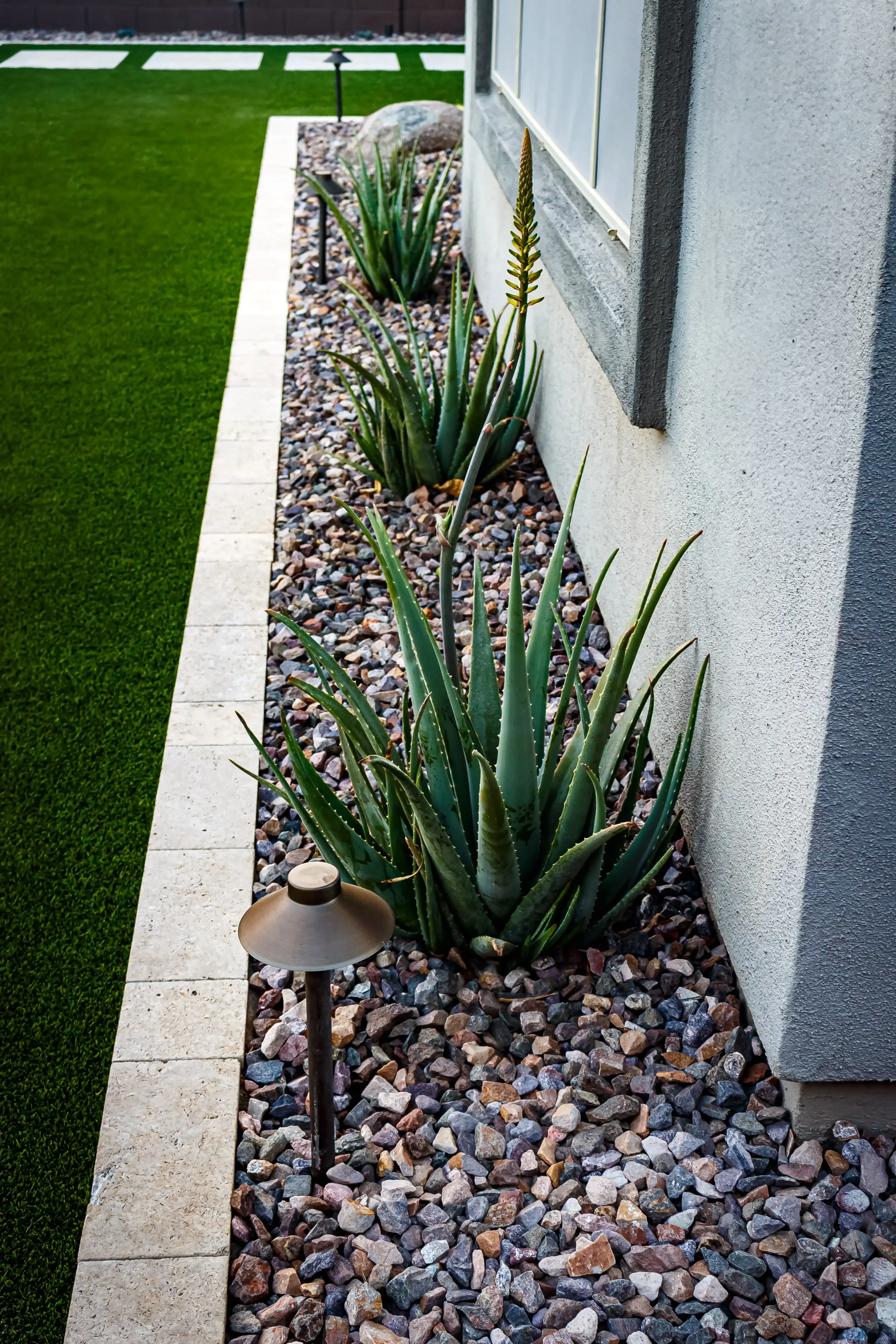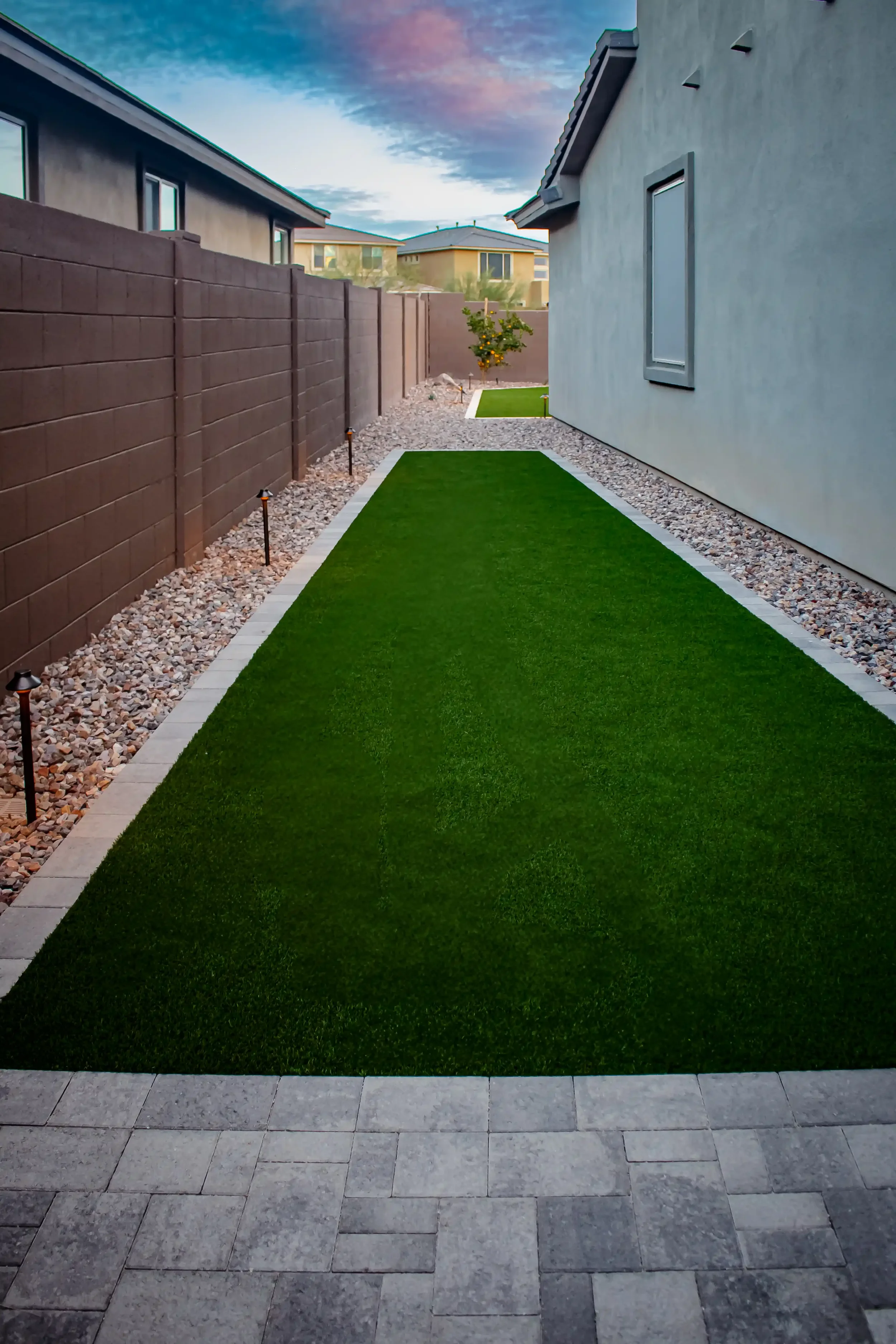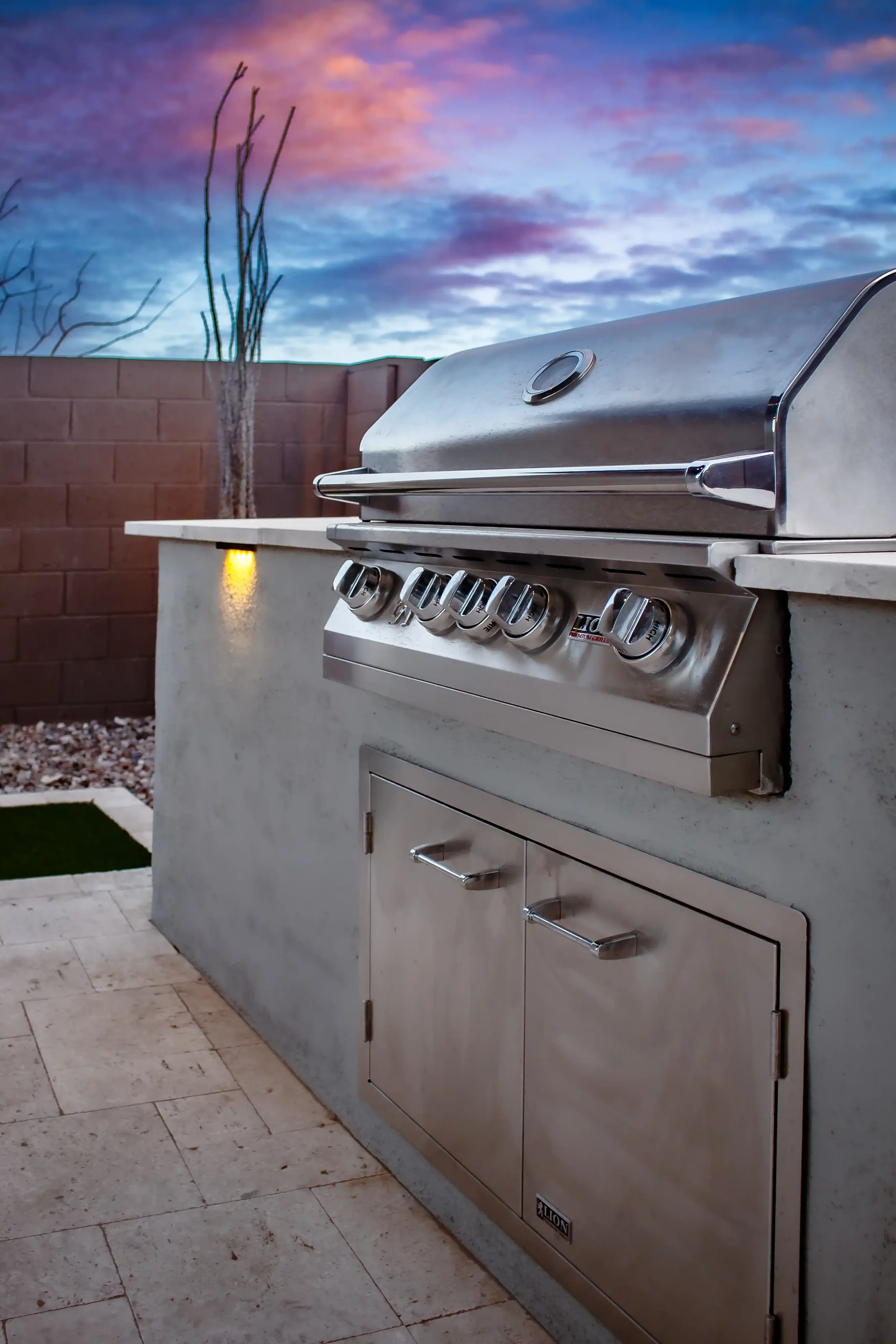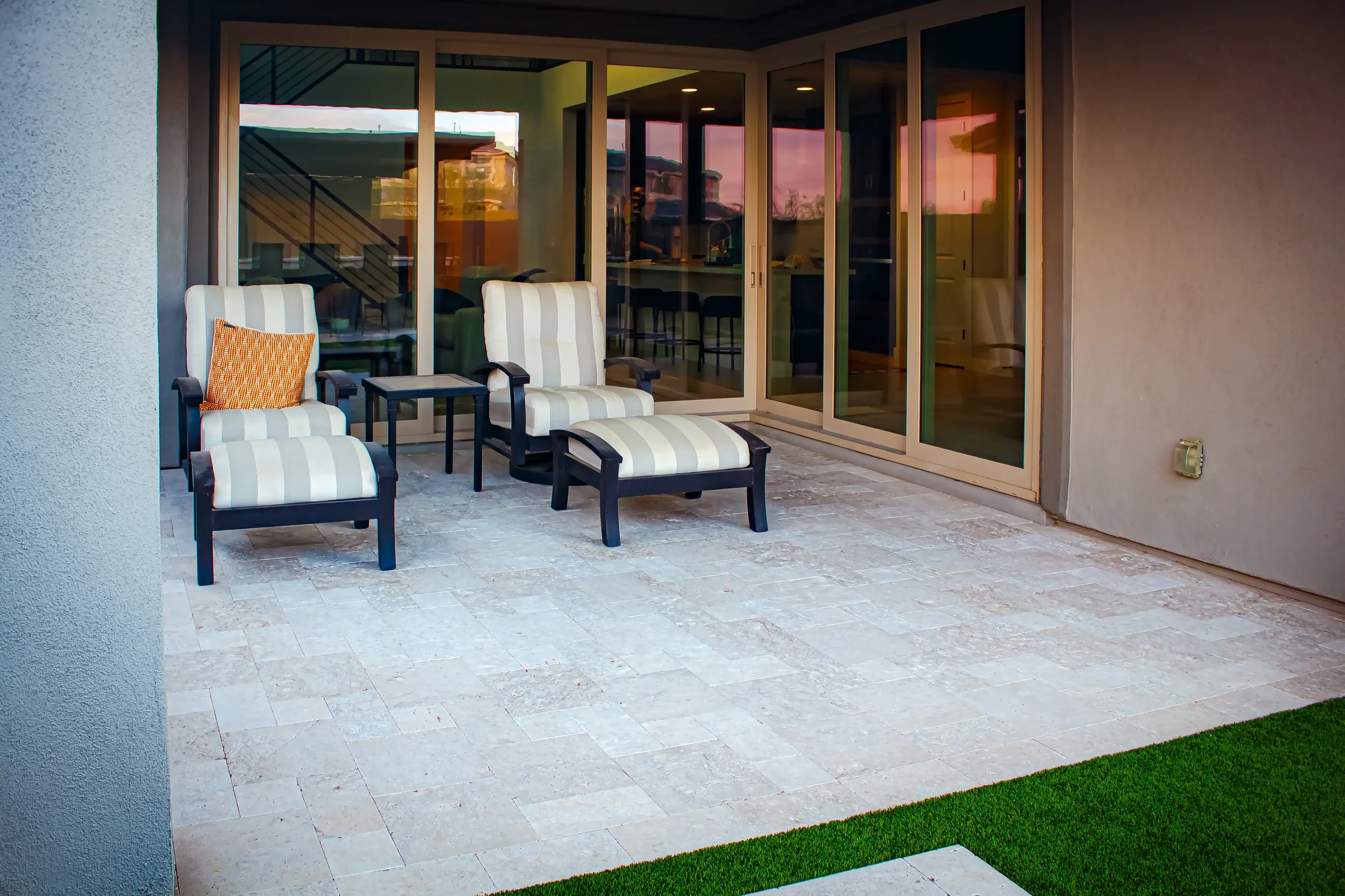 We designed and built a layout centered around a modern pergola, an outdoor kitchen with bar seating, and a comfortable media wall. Two turf areas were added—one for the family and one designed specifically for the dog. Travertine and pavers created a clean, durable foundation that fits the neighborhood. The lighting, planting, and mounding were some of the most appreciated details because they helped the yard feel complete rather than pieced together.