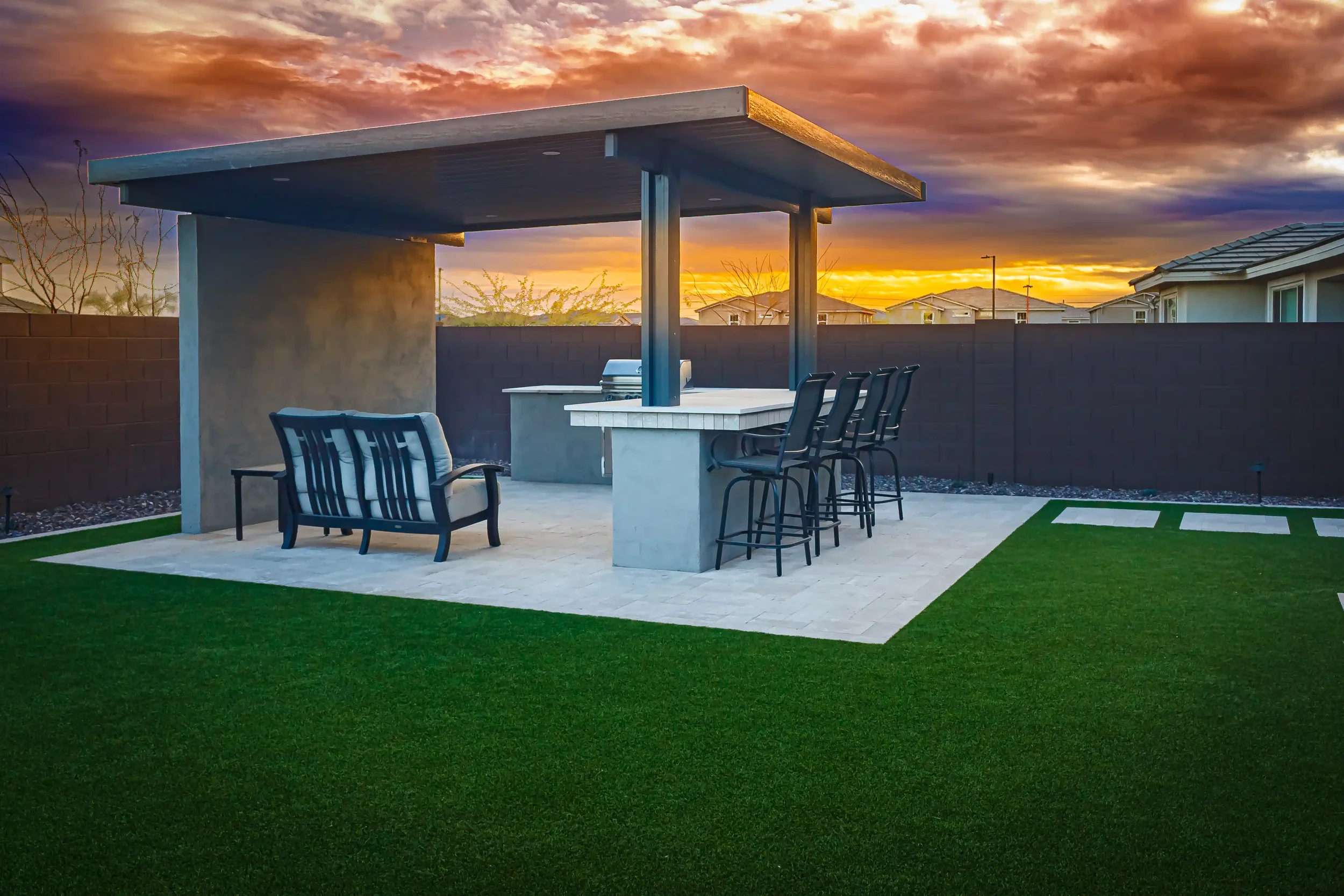 Key Features: Pergola, outdoor kitchen, media wall, family and dog-friendly turf, travertine and pavers